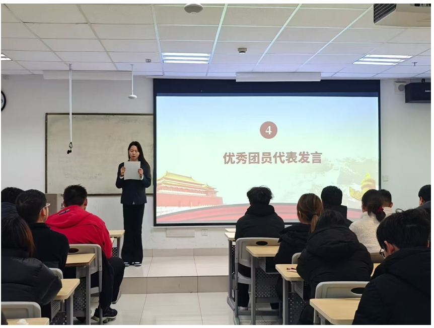 优秀团员代表李彦兴随后发言,她向新团员表示祝贺,并结合自身成长经历,勉励大家牢记誓言、坚定信念、勤学修德、勇于担当,将个人理想追求融入国家发展大局,以实干践行“请党放心,强国有我”的青春誓言。