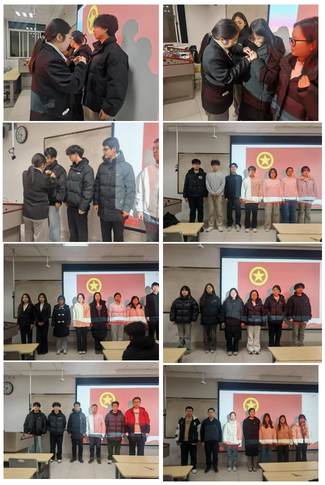 仪式最后,全体团员齐声高唱中国共产主义青年团团歌。歌声激昂,展现了团员青年对组织的忠诚与新时代的青春风采。随后,王国珍为新团员逐一佩戴团徽。这枚徽章不仅是身份的象征,更是激励团员铭记责任、砥砺前行的精神标识。