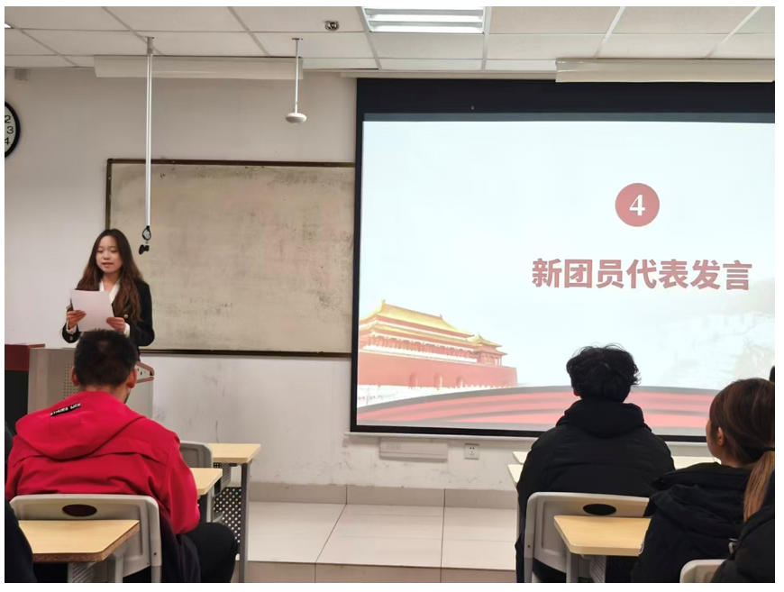 宣誓完毕后,新团员代表李雪雅发言。她表示,加入共青团既是光荣,更意味着沉甸甸的责任。她承诺将严格遵守团章,履行团员义务,以优秀团员为榜样,勤奋学习、锤炼品格、勇挑重担,在学习与生活中切实发挥先锋模范作用,以实际行动践行入团誓言,不负组织的培养与时代的重托。