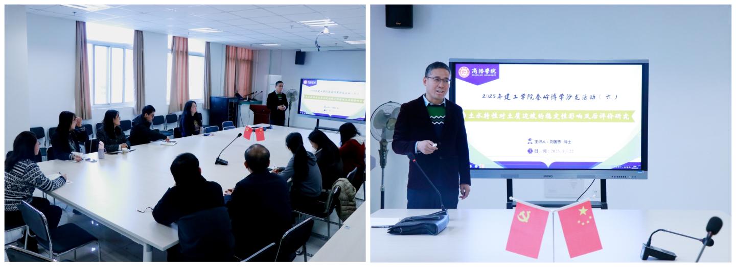 活动由土木工程系主任曹琛主持,对本次活动的内容作了概括性介绍,由土木工程系刘国栋博士作学术报告《土水特性对土质边坡的稳定性影响及后评价研究》。刘国栋博士首先介绍了边坡稳定性分析中的理论与方法,描述了边坡工程运行中遇到的特殊问题,就土石坝坡在库水位升降过程中的稳定性展开探讨,发现土石坝迎水面和背水面边坡稳定系数的滞回现象,并就两者的一致性进行了分析。其后,刘国栋博士对黄土边坡受降雨影响的变形破坏机理进行了深入分析,以现场调查数据为基础,探析了黄土边坡治理效果良好的必要条件,并构建了黄土边坡后评价的模糊综合理论框架。报告紧扣主题,分析深入,展现了公司科研一线教师的科研功底和科研风貌。