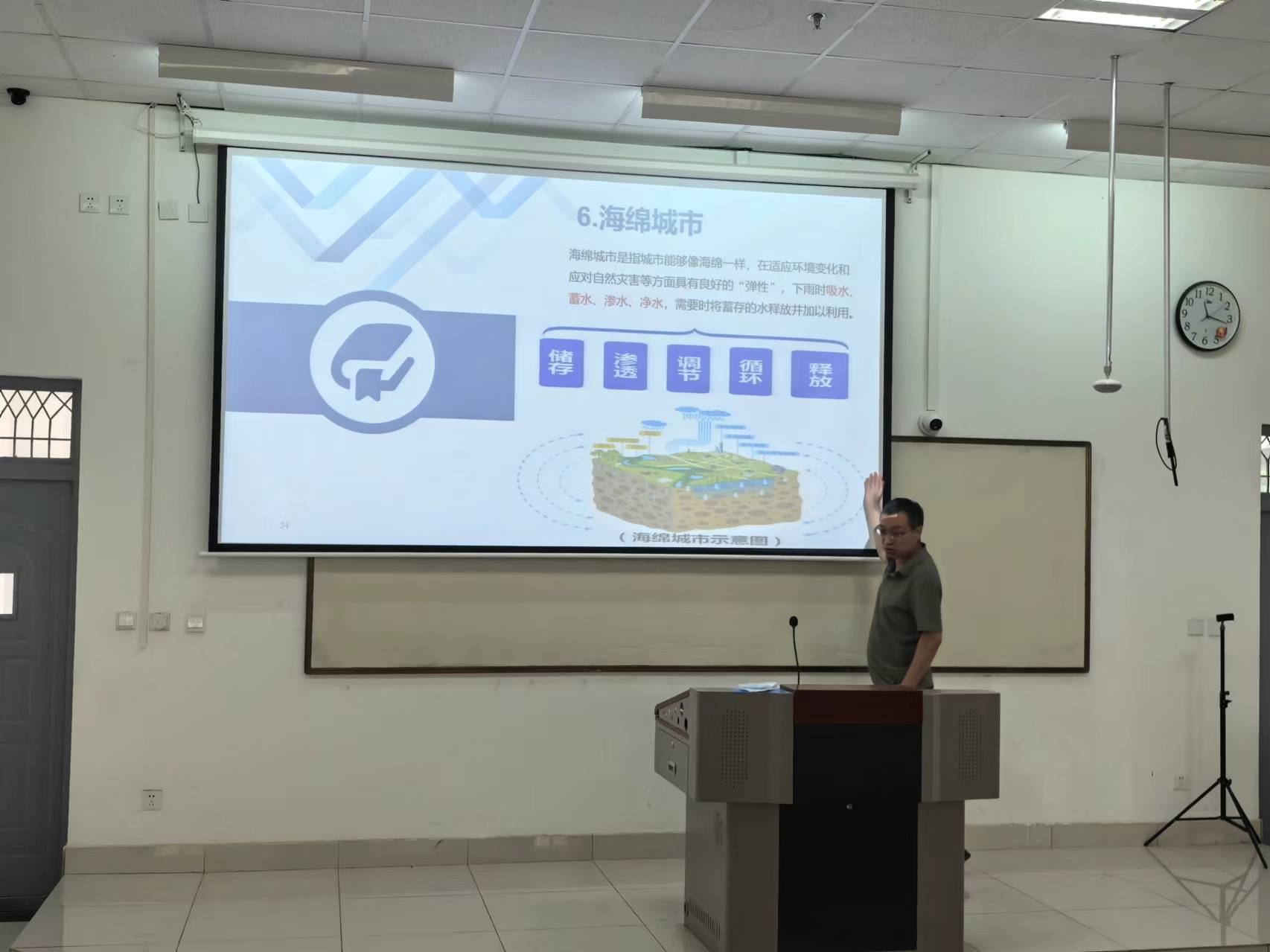 接着,郭庆军教授做了题为《土木工程建造与管理前沿》的报告,报告从工程管理的前沿智慧城市、综合管廊、智慧工地、海绵城市、绿色施工、特色小镇、绿色建筑、智能建造等14个方面进行了深入浅出的讲解,分析了每个方向的特点及发展趋势,并建议同学们不断关注学科前沿、发展自身优势、取长补短等,以及在学习知识的同时还要注重实践技能的提升。